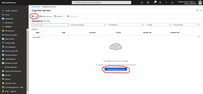 Search “Cognitive Service” in the upper search box and click the result below. You will get an “Add” option in the top left corner below “Cognitive Services” heading or, you can click on the middle of the page where “ Create Cognitive Services” is written. See the picture below
