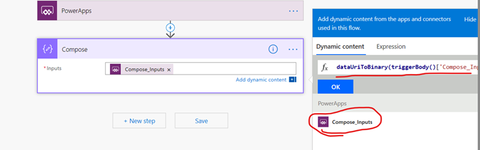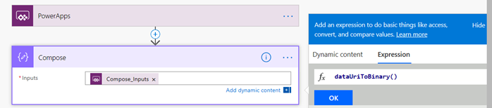 The expression will be like: dataUriToBinary(triggerBody()[‘Compose_Inputs’])