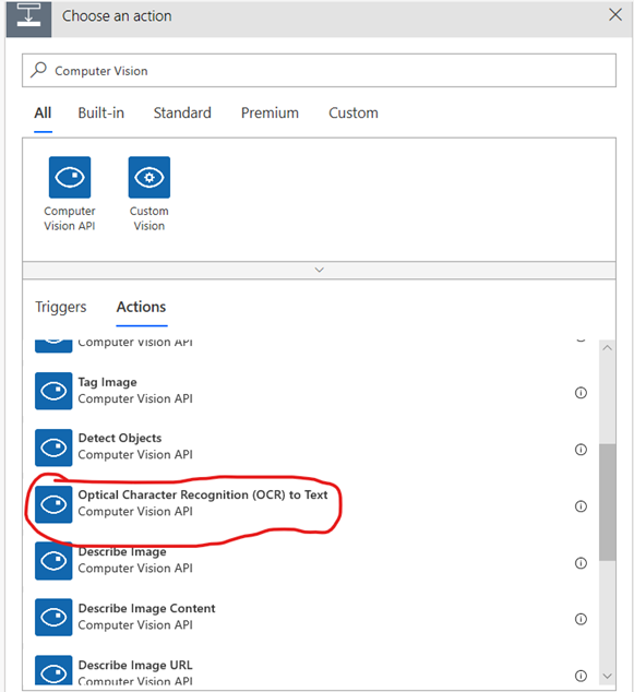 Click +New step Type “ Computer vision” and click the first result Computer Vision API select the Optical Text Recognition(OCR) to Text(Preview) action as shown in the below picture. It will scan for any text on our picture and convert to text.