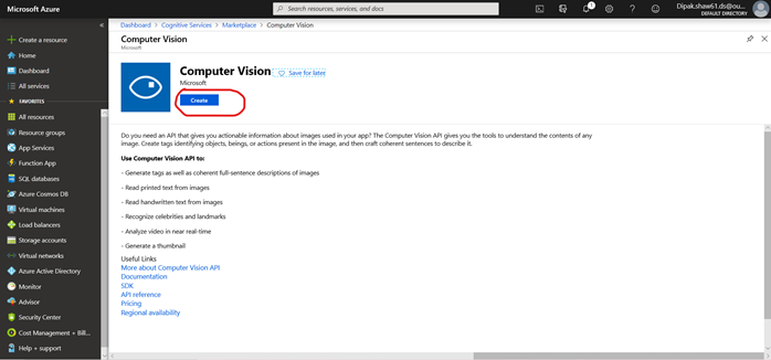 After clicking Add button a marketplace of AI + Machine Learning will open. In this marketplace screen search for Computer Vision, click on the result below and Click Create.