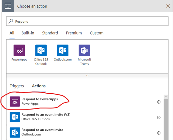 After converting to text, we need to respond the text back to PowerApps. Select + New Step and search “Respond” and click Respond to PowerApps action. See the below picture.