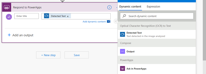 Select “Add an Output” and select text. Leave the title to be blank and in the value to respond select the Detected Text Dynamic content from the Dynamic Panel shown in the below picture.