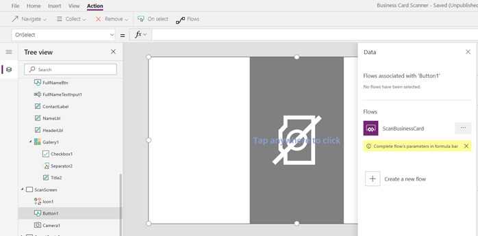 Go to the canvas app and select Scan Screen > Button1. We will create a collection to store the scanned texts retrieved from flow. Choose its OnSelect function and select the Action tab then select the flow option, A data panel will open Contains the flow that we created in the previous step.