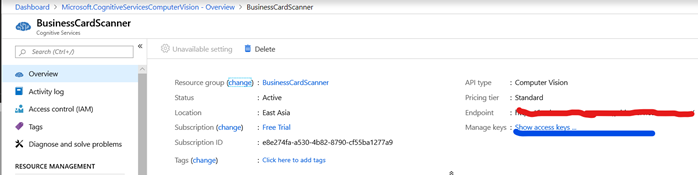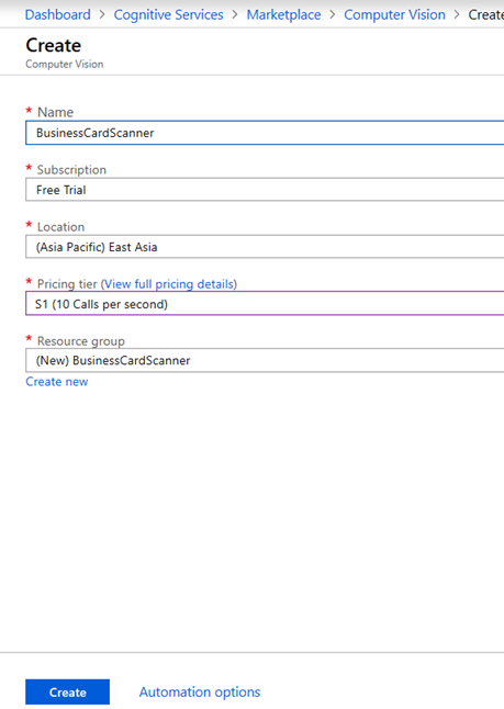 A form will open, here enter name “BusinessCardScanner”, subscription will be auto selected to Free, thereafter select the nearest Location to your country, in this case I’m going to select “East Asia” which is near to me. After that select the Pricing tier to “S1 (10 Calls per second)”, in Resource Group click create new and enter “BusinessCardScanner” click ok. Your form will look like this.