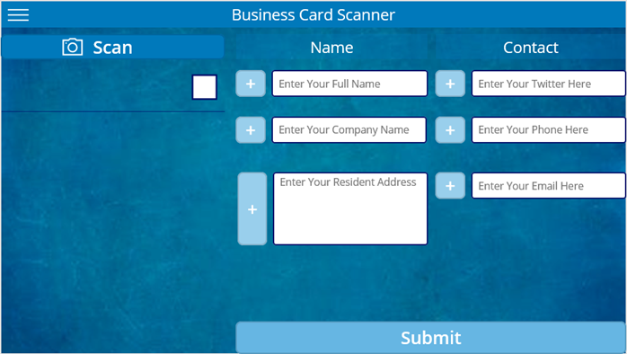 First, log in to https://make.powerapps.com and select Canvas App from Blank and enter name “Business Card Scanner”. In this task our goal is to make our main screen looks like the picture below.