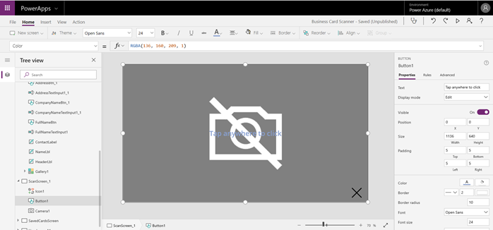 After that insert a button and change its fill property to None[ RGBA(0,0,0,0)] so that it won’t display over the camera while taking pictures and set the Text property of the button to “Tap anywhere to click” just like the above picture.
