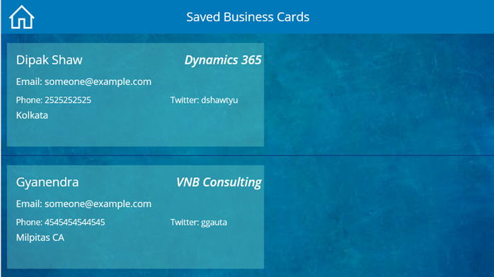 Let’s go to our canvas app studio and add a new screen and rename “SavedBusinessCardsScreen”. This screen is very simple but needs some customizations showing the cards. So, after adding the screen insert a header label and name it “Saved Business Cards” and add a Home icon in the top left corner of the app. It will redirect from Saved Cards Screen to the Main Screen. The OnSelect of the Home button will be Navigate(MainScreen, Fade). See the picture below.